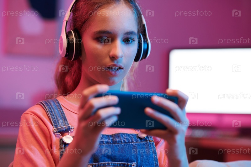 Удивленная девочка-подросток играет в игру на смартфоне