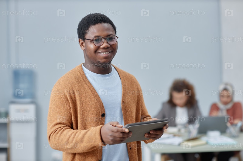 Счастливый молодой афроамериканский аналитик-мужчина с планшетом, смотрящий на камеру