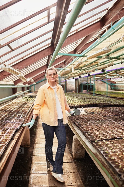 Молодая красивая женщина-работница большого зеленого дома отдыхает