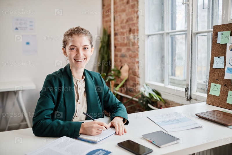 Молодая успешная бизнесвуменка планирует рабочий день, сидя за своим столом