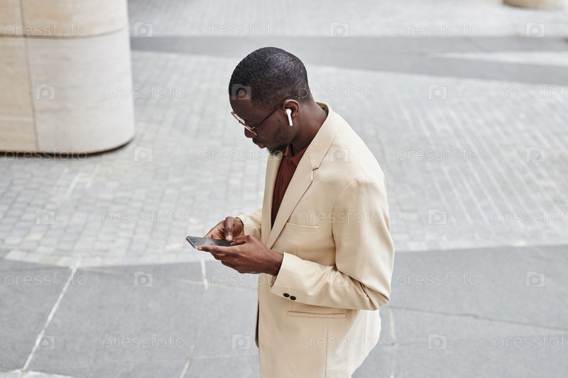 Высокий угол молодого бизнесмена в костюме пастельного цвета, отправляющего сообщения по мобильному телефону