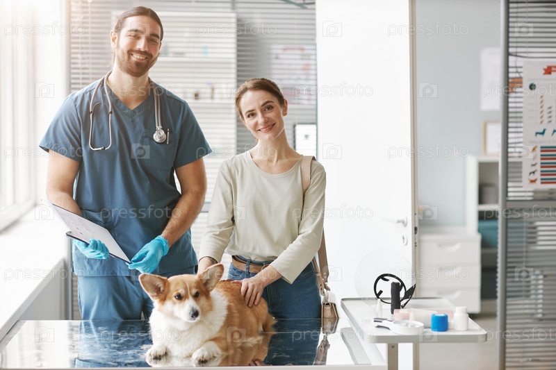 Счастливый молодой владелец собаки-корги и ветеринар в форме
