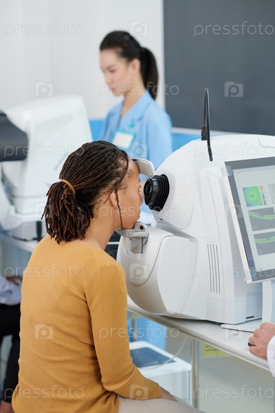 Глаза женщины проверяются с помощью камеры сетчатки