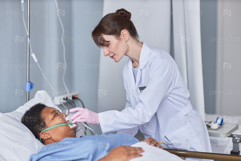 Тщательная медсестра ставит маску для поддержки кислорода на пациента пожилого возраста в больничной комнате