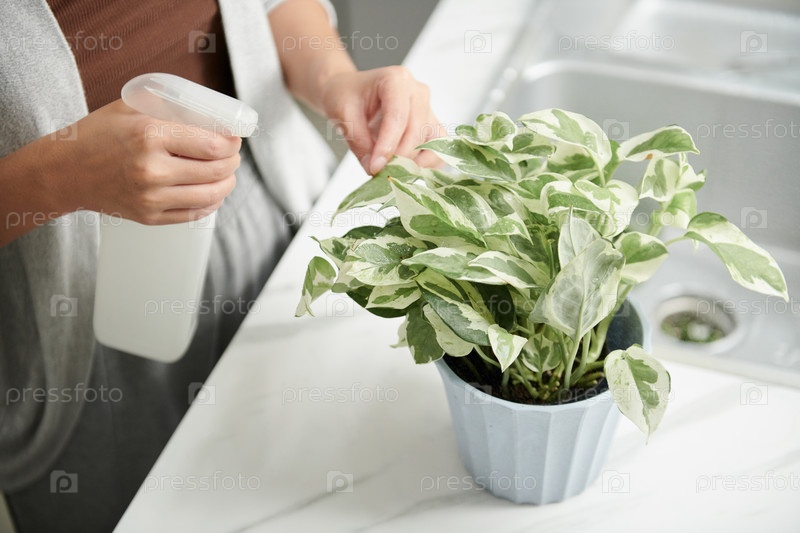 Женщина кладет растение на кухонный стол