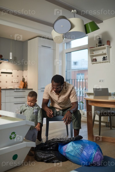 Отец и сын сортируют пластиковые отходы