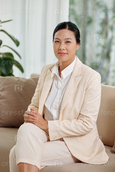 Молодая улыбающаяся брюнетка предпринимательница, сидящая на диване