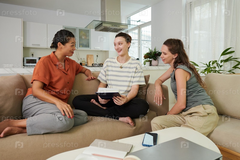 Трое друзей смотрят вместе фотографии