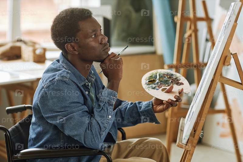 Молодой задумчивый афроамериканский художник с кистью, сидящий в инвалидном кресле