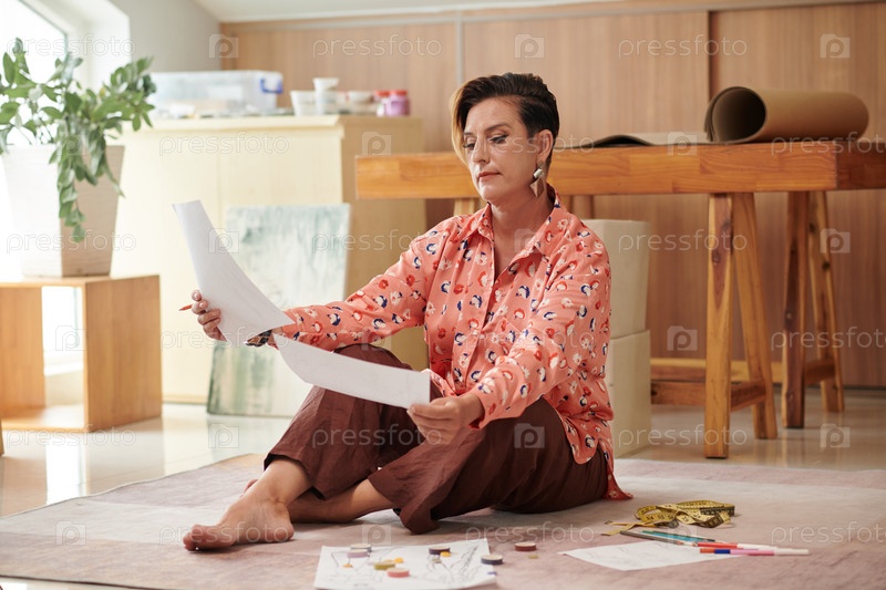 Вдумчивая модельерка смотрит на модные эскизы, которые она нарисовала