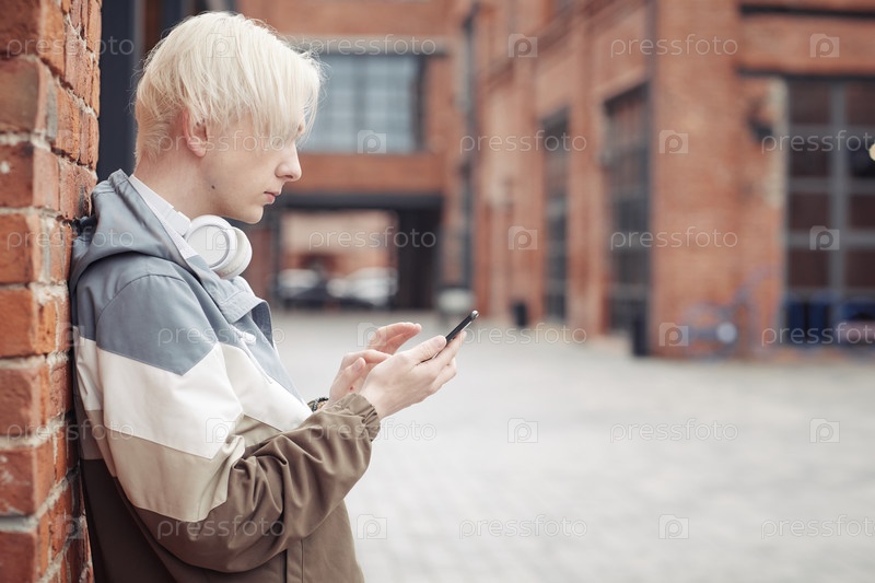 Подросток с светлыми волосами стоит у стены кирпичного здания и пишет смс
