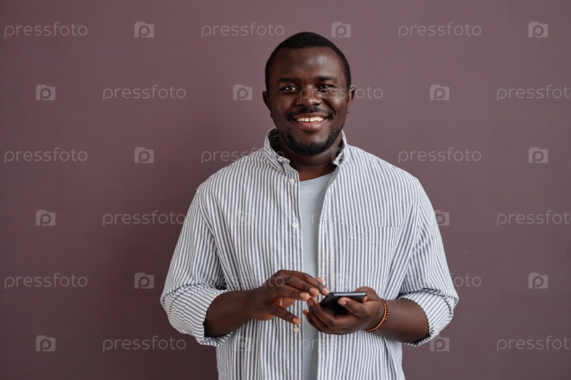 Чернокожий мужчина с откровенными эмоциями стоит против фиолетового цвета и держит смартфон