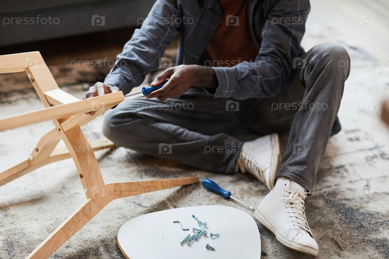 Молодой человек собирает стол Close Up Young Man