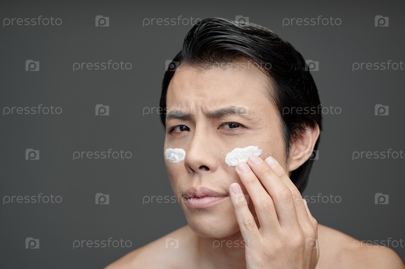 Нахмурившийся мужчина наносит увлажняющий крем