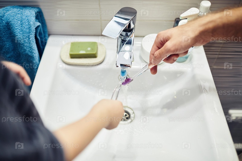 Ребенок чистит зубы с родительским Closeup