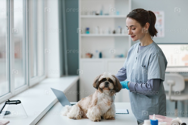 Молодой ветеринарный специалист в форме осматривает йоркширского терьера