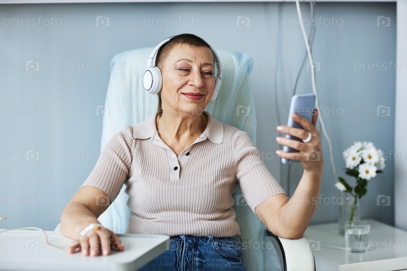 Улыбающаяся пожилая женщина, использующая смартфон с наушниками во время инвентарного лечения капель