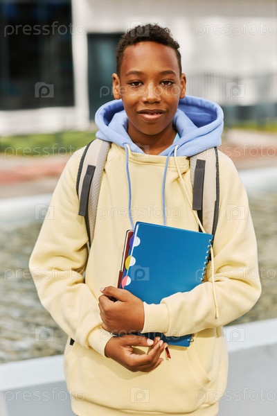 Улыбающийся афроамериканский школьник с копирайтерами и рюкзаком