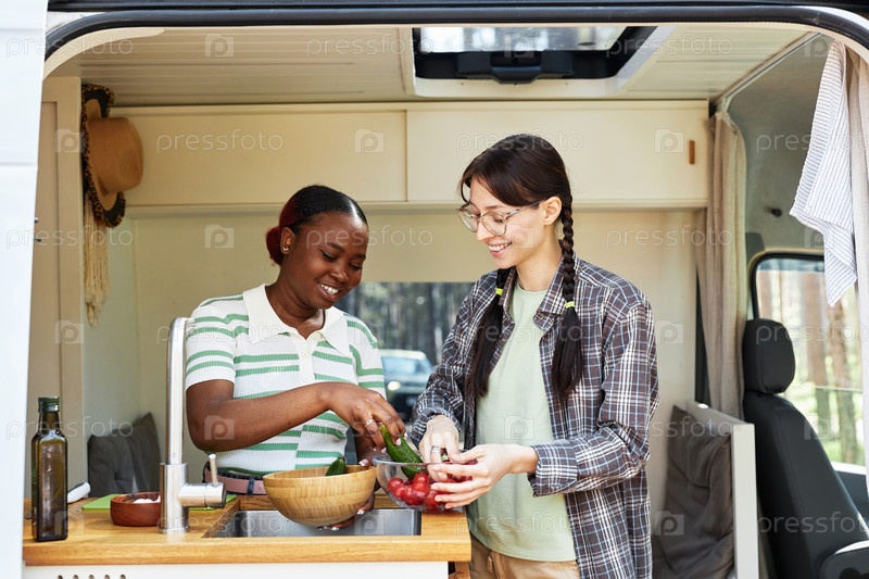 Девушки вместе стирают овощи для салата