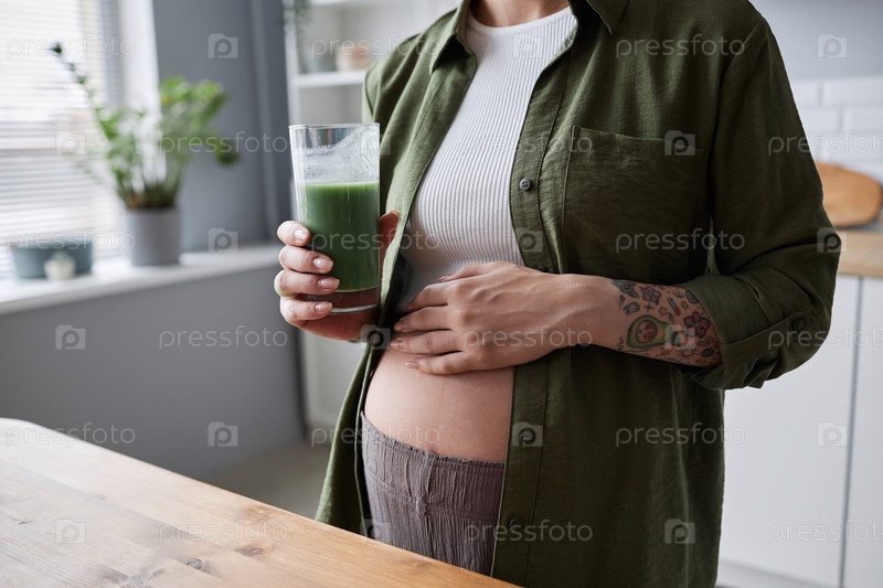 Ближайшее изображение беременной молодой женщины, пьющей смузи на утреннем животе