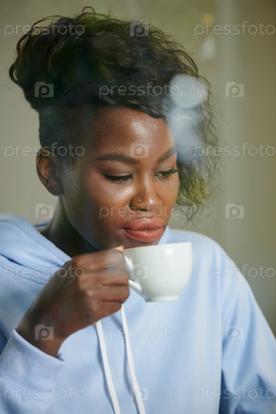 Пенсивная женщина пьет кофе