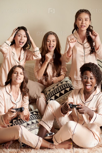 Друзья поддерживают девочек, играющих в видеоигры