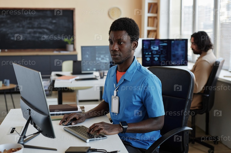 Молодой серьезный афроамериканский программист, сидящий перед компьютером