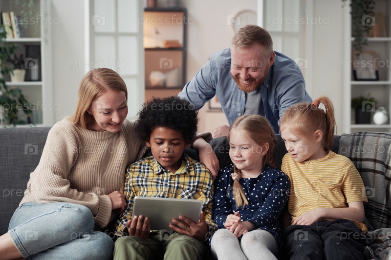 Большая семья, использующая планшетный компьютер дома