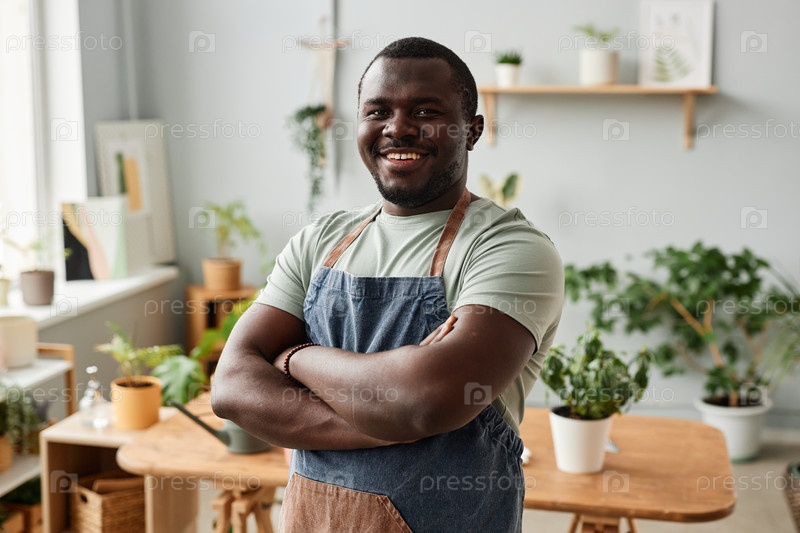 Улыбающийся чернокожий мужчина в роли садовника позирует с зеленью внутри и смотрит на камеру