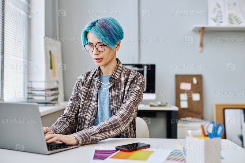 Творческий молодой человек с голубыми волосами, использующий ноутбук в офисе