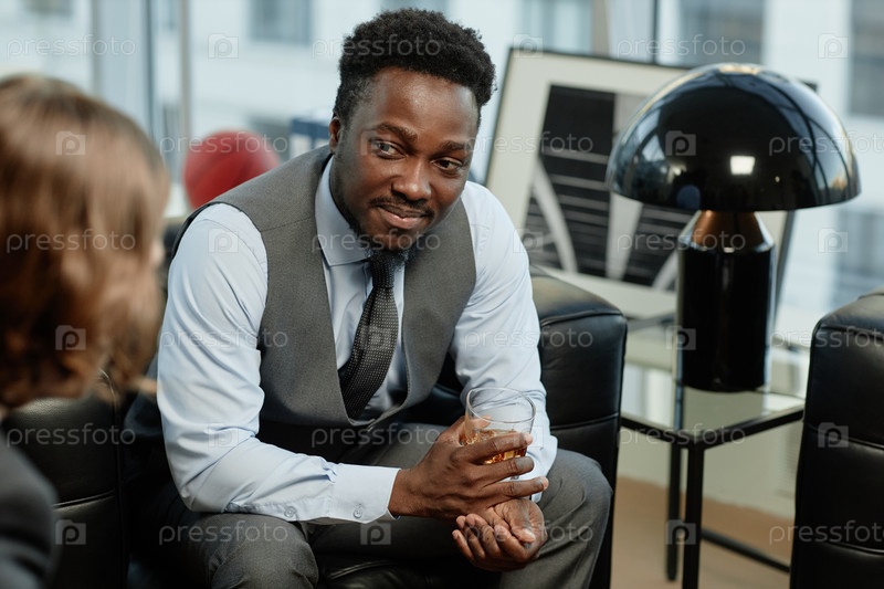 Чернокожий бизнесмен встречается с коллегой в офисе и пьет виски