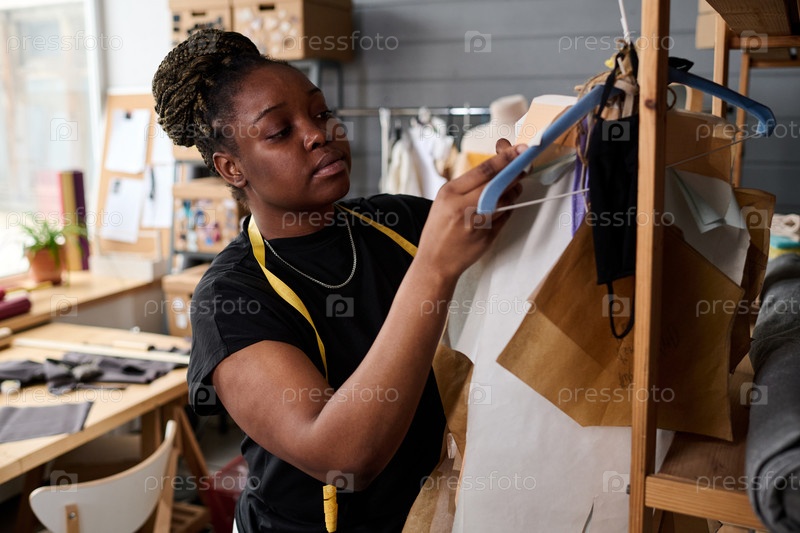 Молодая чернокожая женщина с желтой измерительной лентой на шее выбирает рисунок