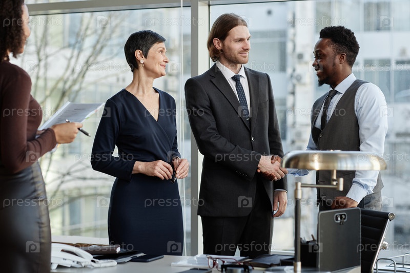 Группа улыбающихся деловых партнеров, рукопожатые в офисе