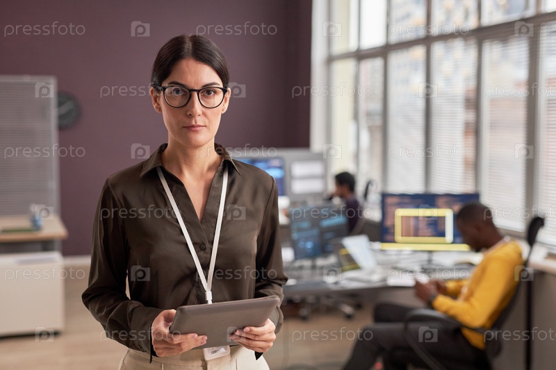 Женщина в очках смотрит на камеру, стоя в офисе ИТ-разработки