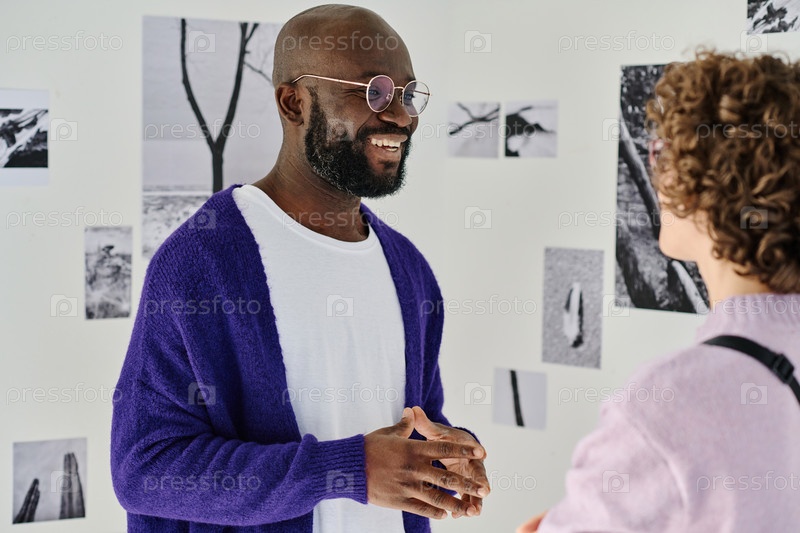 Мужчина обсуждает искусство с женщиной в галерее