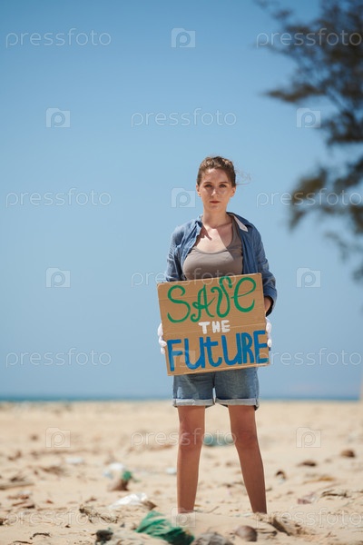 Доброволец стоит на грязном пляже