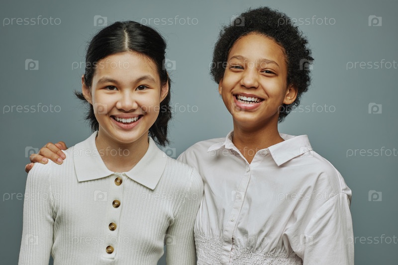Две веселые межкультурные дружелюбные девушки в белых рубашках