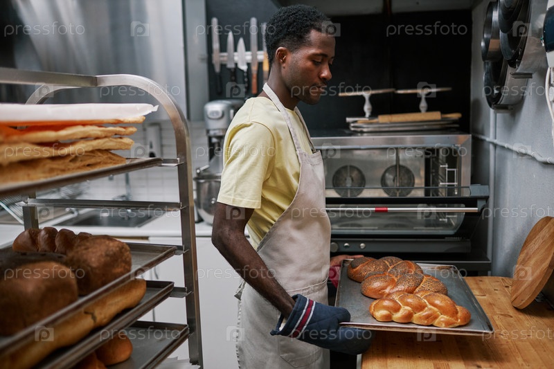 Пекарь кладет поднос с хлебом на стол