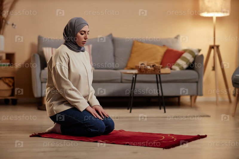 Молодая мусульманка держит глаза закрытыми, когда преклоняется на красном ковре