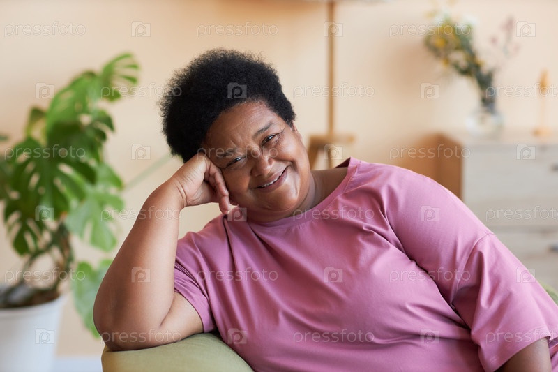 Счастливая афроамериканская старшая женщина в розовой футболке, сидящая в кресле