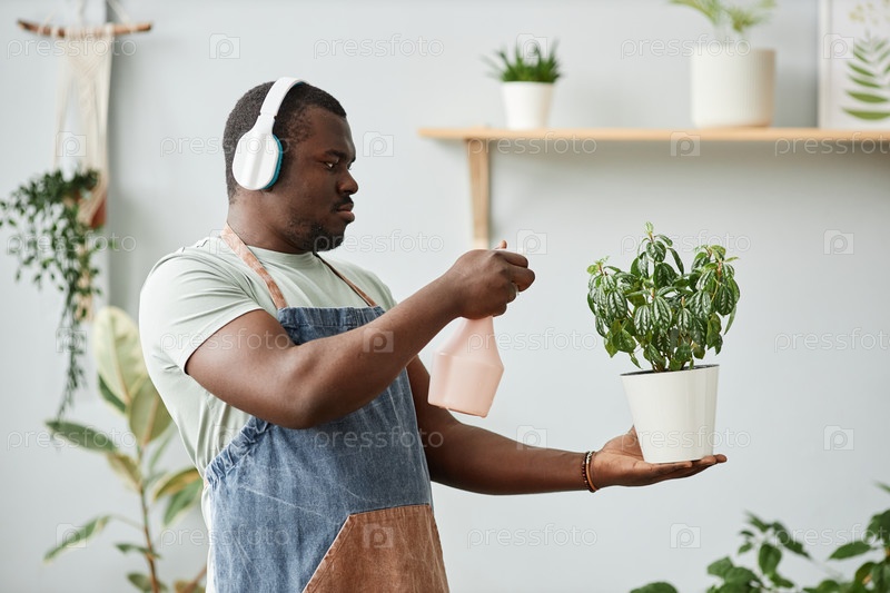 Боковой вид взрослый чернокожий мужчина, ухаживающий за зелеными растениями дома и носящий наушники