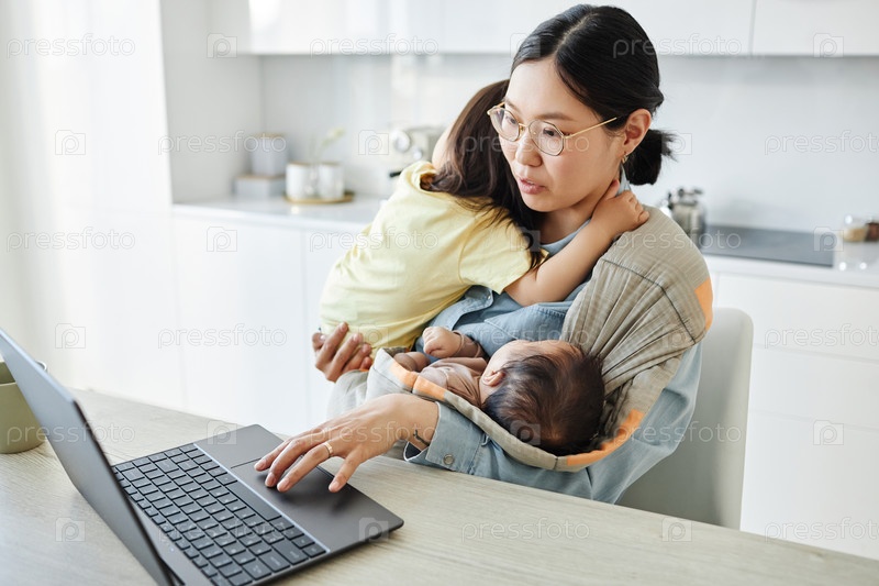 Женщина с двумя детьми работает в Интернете на ноутбуке