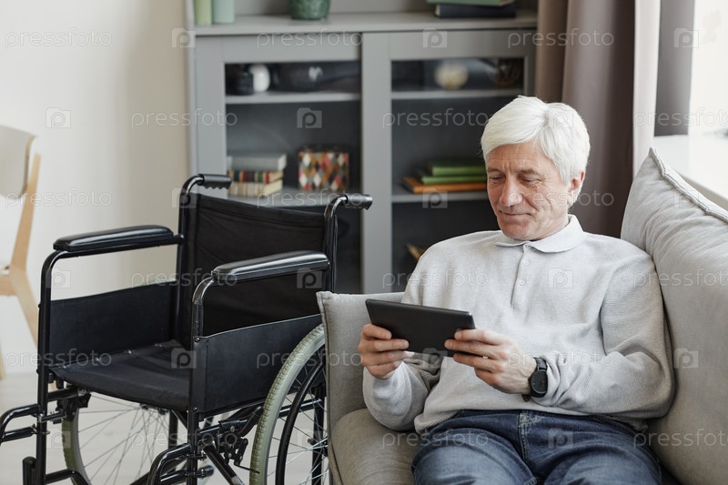 Улыбающийся пожилой человек с инвалидностью использует планшет на диване