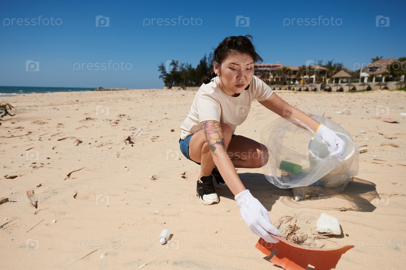 Молодая женщина убирает прибрежную зону