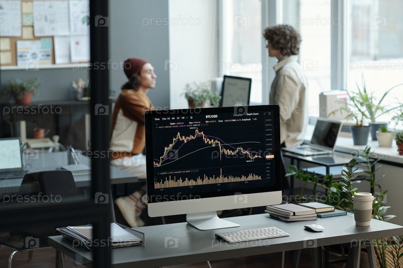 Сосредоточьтесь на экране компьютера с графическими данными, полученными аналитиком рынка