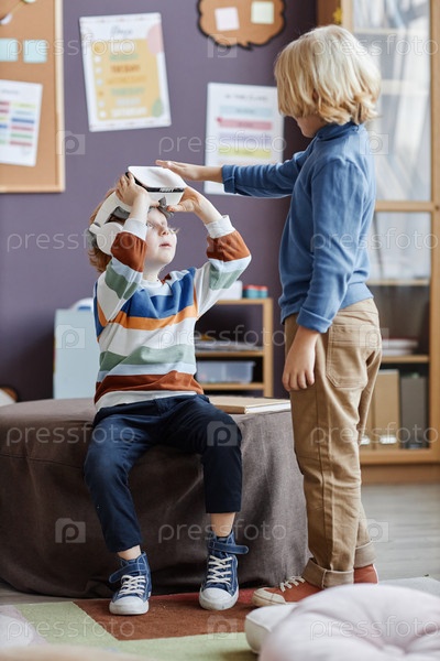 Два очаровательных ученика детского сада обсуждают виртуальную игру