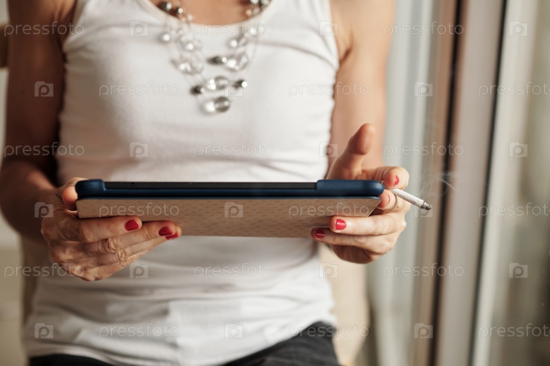 Курящая женщина читает статью