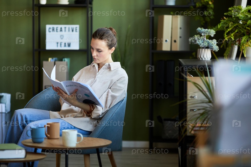 Молодой экономист в повседневной одежде сидит в кресле и просматривает руководство