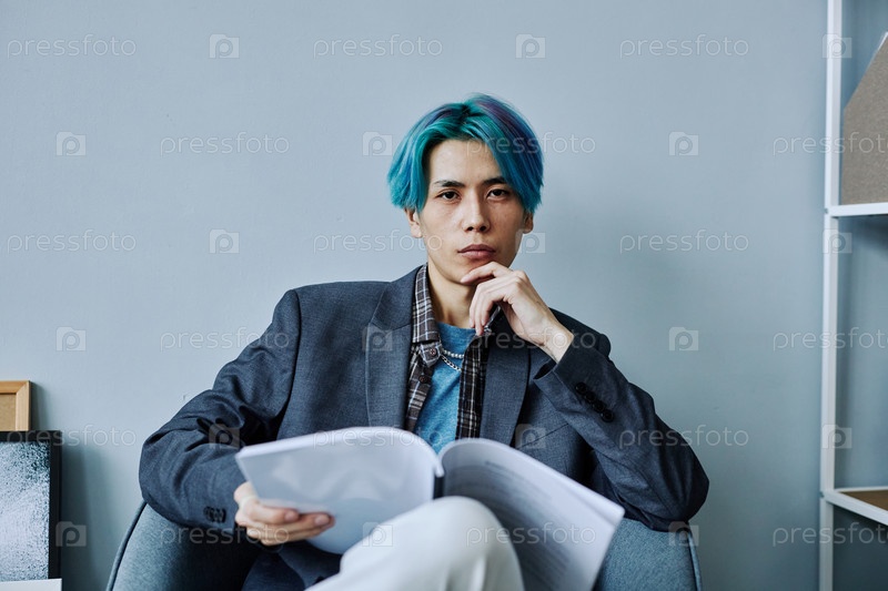 Молодой азиатский мужчина сидит на стуле в офисе и с уверенностью смотрит на камеру