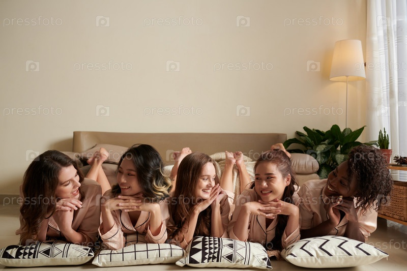 Позитивные женщины лежат на полу